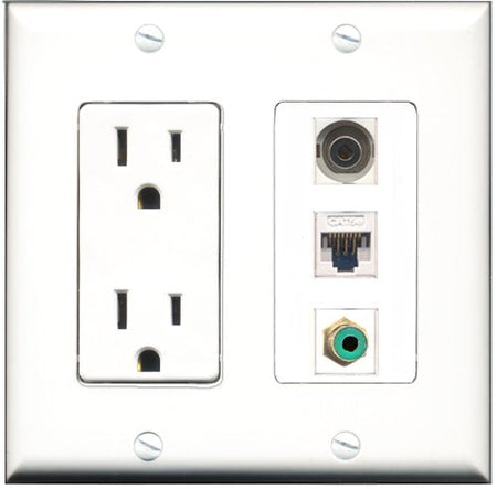 RiteAV - 15 Amp Power Outlet 1 Port RCA Green 1 Port 3.5mm 1 Port Cat5e Ethernet White Decorative Wall Plate