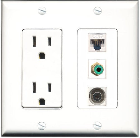 RiteAV - 15 Amp Power Outlet 1 Port RCA Green 1 Port 3.5mm 1 Port Cat5e Ethernet White Decorative Wall Plate