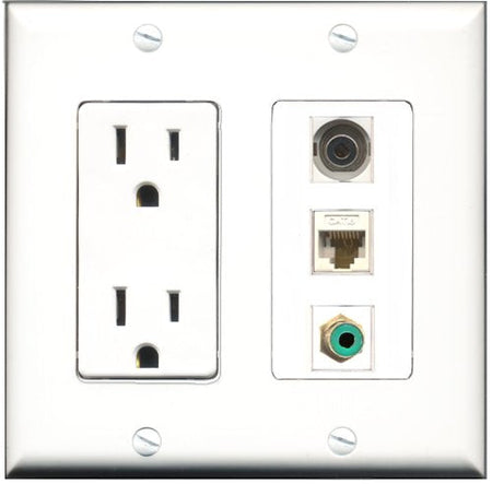 RiteAV - 15 Amp Power Outlet 1 Port RCA Green 1 Port 3.5mm 1 Port Cat6 Ethernet Ethernet White Decorative Wall Plate