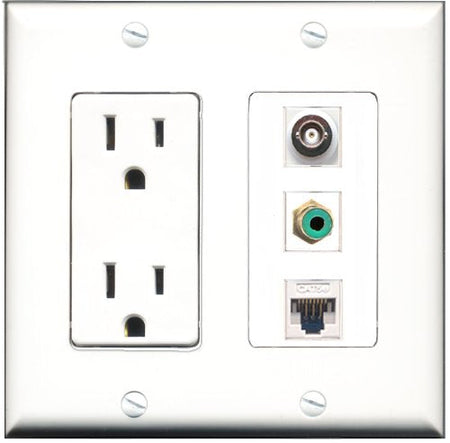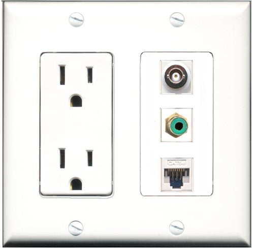 RiteAV - 15 Amp Power Outlet 1 Port RCA Green 1 Port BNC 1 Port Cat5e Ethernet White Decorative Wall Plate