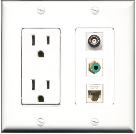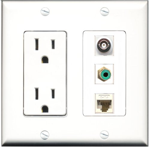 RiteAV - 15 Amp Power Outlet 1 Port RCA Green 1 Port BNC 1 Port Cat6 Ethernet Ethernet White Decorative Wall Plate