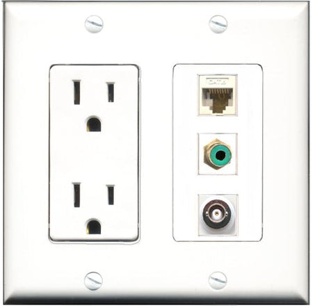 RiteAV - 15 Amp Power Outlet 1 Port RCA Green 1 Port BNC 1 Port Cat6 Ethernet Ethernet White Decorative Wall Plate
