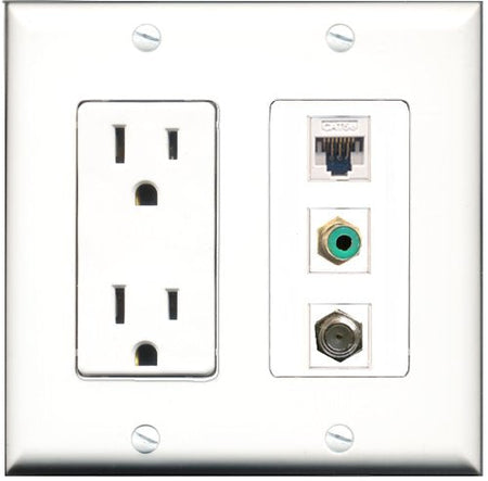 RiteAV - 15 Amp Power Outlet 1 Port RCA Green 1 Port Coax 1 Port Cat5e Ethernet White Decorative Wall Plate