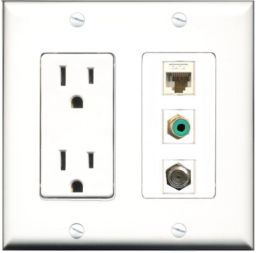 RiteAV - 15 Amp Power Outlet 1 Port RCA Green 1 Port Coax 1 Port Cat6 Ethernet Ethernet White Decorative Wall Plate