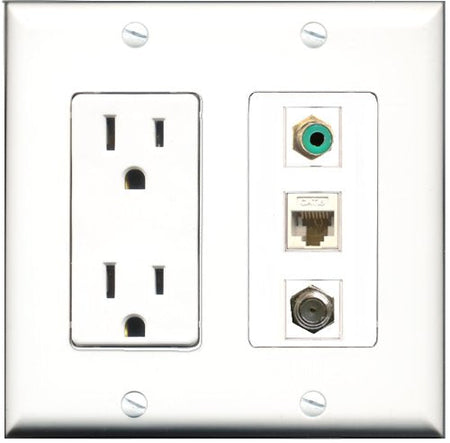 RiteAV - 15 Amp Power Outlet 1 Port RCA Green 1 Port Coax 1 Port Cat6 Ethernet Ethernet White Decorative Wall Plate