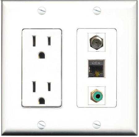 RiteAV - 15 Amp Power Outlet 1 Port RCA Green 1 Port Coax 1 Port Shielded Cat6 Ethernet Ethernet Decorative Wall Plate