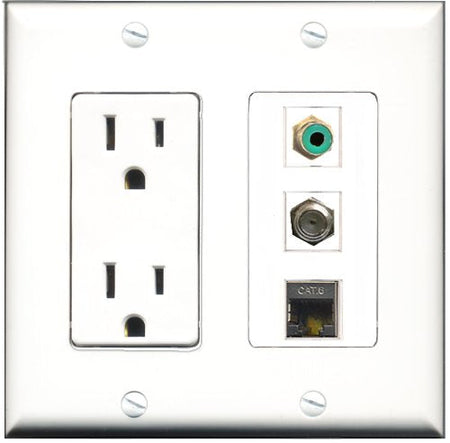 RiteAV - 15 Amp Power Outlet 1 Port RCA Green 1 Port Coax 1 Port Shielded Cat6 Ethernet Ethernet Decorative Wall Plate
