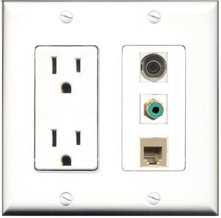 Please note: It is required to install this item in a divided outlet box. Recommended compatible outlet boxes Carlon BH234R (Old work). This is a 2 Piece Decorative Wall Plate (plate and plate cover). Tooless connection, Just plug one cable into the front and one into the back. Outlet needs to be hard wired as a regular outlet. High quality, screws included. Fits standard outlet boxes, decora(tive) plates and mounting brackets. Female on both sides of the plate jacks for easy plugin. 4 inch distance between screws. This is not a GFCI outlet and is not to be installed near or behind a kitchen sink, bathtub, bathroom or within 12-15 feet of any source of water. Must be installed into a new or existing plastic or metal outlet electrical box for safety. Do not install this with a drywall only mounting bracket.