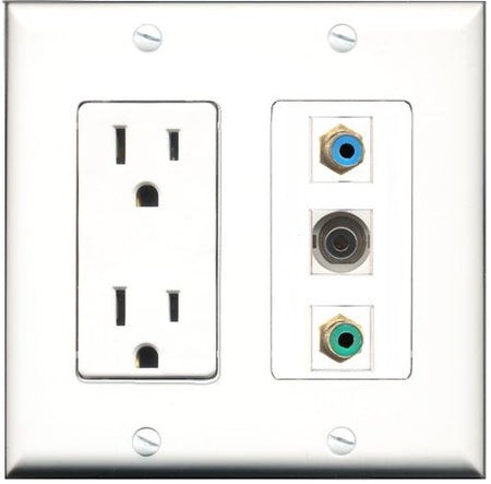 RiteAV - 15 Amp Power Outlet 1 Port RCA Green 1 Port RCA Blue 1 Port 3.5mm Decorative Wall Plate