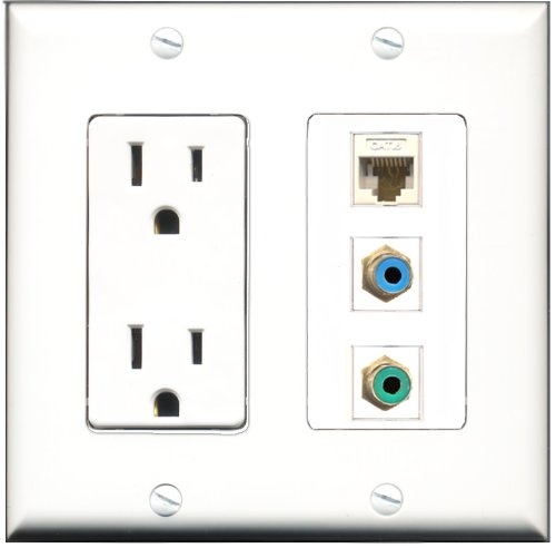 RiteAV - 15 Amp Power Outlet 1 Port RCA Green 1 Port RCA Blue 1 Port Cat6 Ethernet Ethernet White Decorative Wall Plate