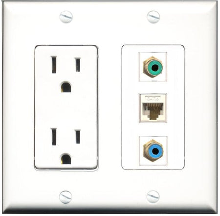 RiteAV - 15 Amp Power Outlet 1 Port RCA Green 1 Port RCA Blue 1 Port Cat6 Ethernet Ethernet White Decorative Wall Plate