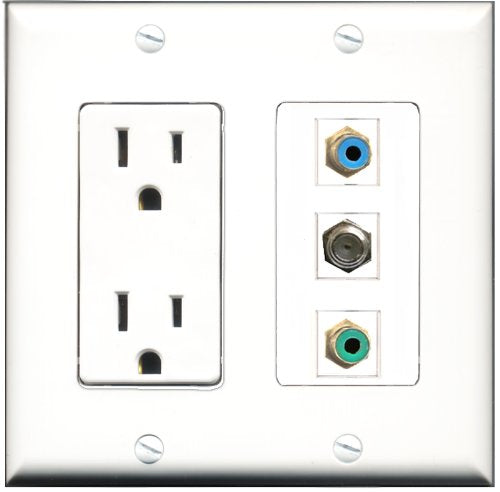 RiteAV - 15 Amp Power Outlet 1 Port RCA Green 1 Port RCA Blue 1 Port Coax Decorative Wall Plate
