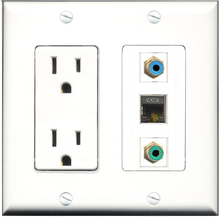 RiteAV - 15 Amp Power Outlet 1 Port RCA Green 1 Port RCA Blue 1 Port Shielded Cat6 Ethernet Ethernet Decorative Wall Plate