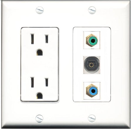 RiteAV - 15 Amp Power Outlet 1 Port RCA Green 1 Port RCA Blue 1 Port Toslink Decorative Wall Plate