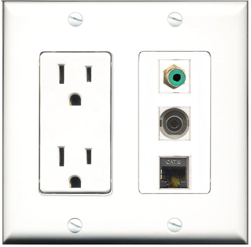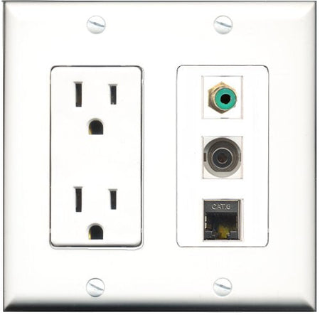RiteAV - 15 Amp Power Outlet 1 Port RCA Green 1 Port Shielded Cat6 Ethernet Ethernet 1 Port 3.5mm Decorative Wall Plate