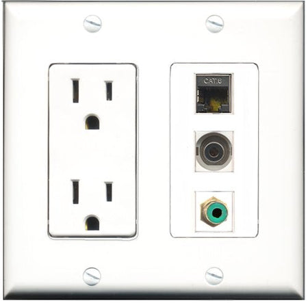 RiteAV - 15 Amp Power Outlet 1 Port RCA Green 1 Port Shielded Cat6 Ethernet Ethernet 1 Port 3.5mm Decorative Wall Plate