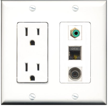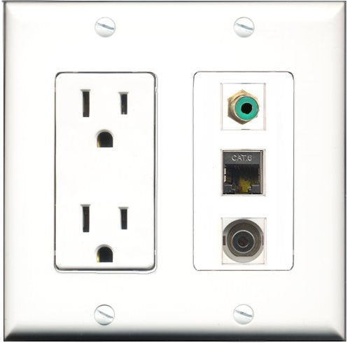 RiteAV - 15 Amp Power Outlet 1 Port RCA Green 1 Port Shielded Cat6 Ethernet Ethernet 1 Port 3.5mm Decorative Wall Plate