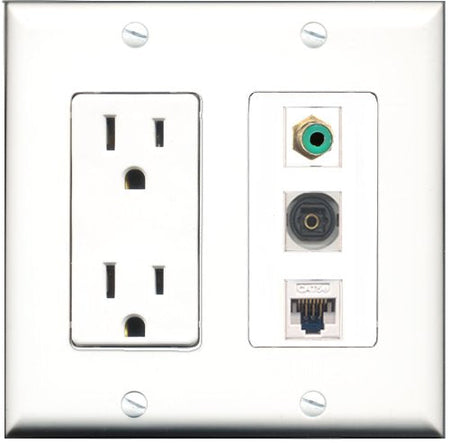 RiteAV - 15 Amp Power Outlet 1 Port RCA Green 1 Port Toslink 1 Port Cat5e Ethernet White Decorative Wall Plate
