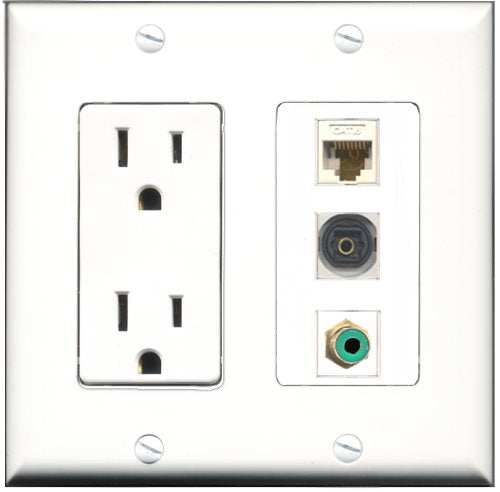 RiteAV - 15 Amp Power Outlet 1 Port RCA Green 1 Port Toslink 1 Port Cat6 Ethernet Ethernet White Decorative Wall Plate