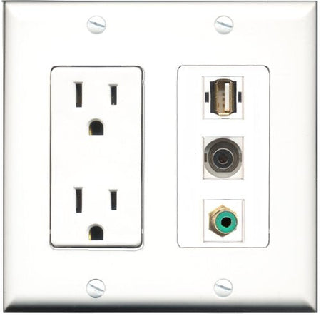 RiteAV - 15 Amp Power Outlet 1 Port RCA Green 1 Port USB A-A 1 Port 3.5mm Decorative Wall Plate