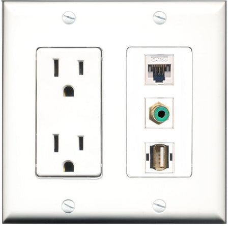RiteAV - 15 Amp Power Outlet 1 Port RCA Green 1 Port USB A-A 1 Port Cat5e Ethernet White Decorative Wall Plate