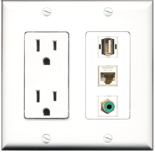 RiteAV - 15 Amp Power Outlet 1 Port RCA Green 1 Port USB A-A 1 Port Cat6 Ethernet Ethernet White Decorative Wall Plate
