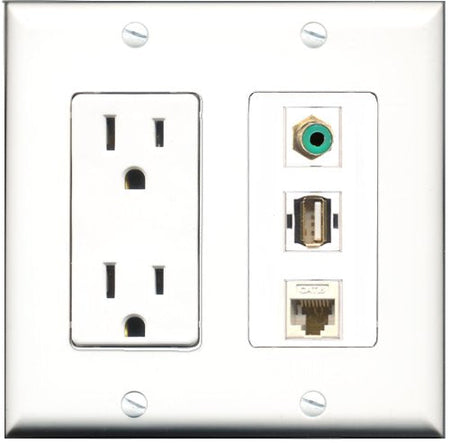 RiteAV - 15 Amp Power Outlet 1 Port RCA Green 1 Port USB A-A 1 Port Cat6 Ethernet Ethernet White Decorative Wall Plate