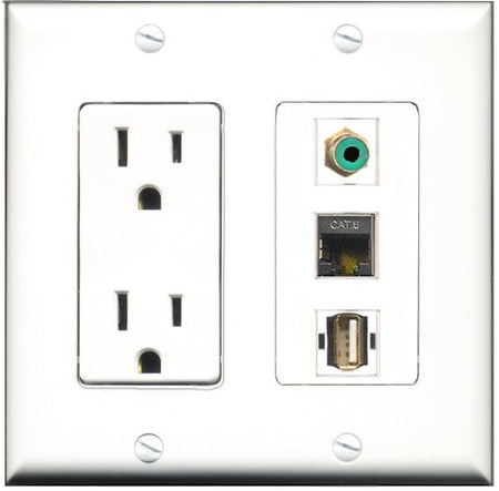 RiteAV - 15 Amp Power Outlet 1 Port RCA Green 1 Port USB A-A 1 Port Shielded Cat6 Ethernet Ethernet Decorative Wall Plate