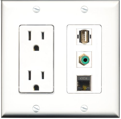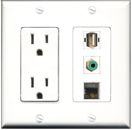 RiteAV - 15 Amp Power Outlet 1 Port RCA Green 1 Port USB A-A 1 Port Shielded Cat6 Ethernet Ethernet Decorative Wall Plate