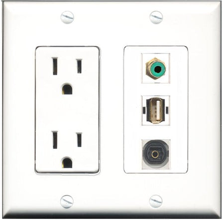 RiteAV - 15 Amp Power Outlet 1 Port RCA Green 1 Port USB A-A 1 Port Toslink Decorative Wall Plate