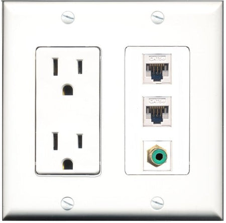 RiteAV - 15 Amp Power Outlet 1 Port RCA Green 2 Port Cat5e Ethernet White Decorative Wall Plate