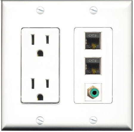 RiteAV - 15 Amp Power Outlet 1 Port RCA Green 2 Port Shielded Cat6 Ethernet Ethernet Decorative Wall Plate