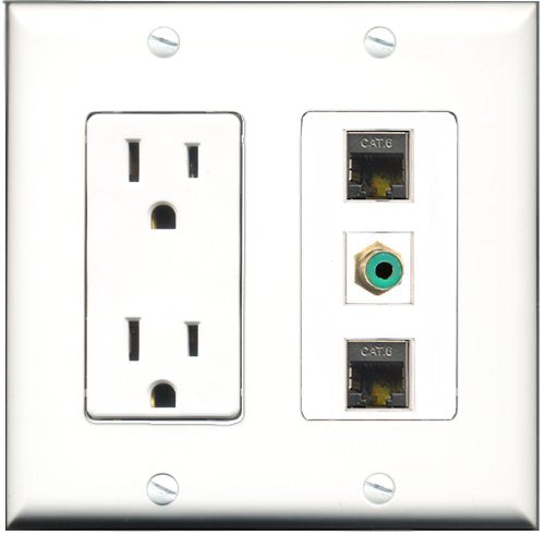 Please note: It is required to install this item in a divided outlet box. Recommended compatible outlet boxes Carlon BH234R (Old work). This is a 2 Piece Decorative Wall Plate (plate and plate cover). Tooless connection, Just plug one cable into the front and one into the back. Outlet needs to be hard wired as a regular outlet. High quality, screws included. Fits standard outlet boxes, decora(tive) plates and mounting brackets. Female on both sides of the plate jacks for easy plugin. 4 inch distance between screws. This is not a GFCI outlet and is not to be installed near or behind a kitchen sink, bathtub, bathroom or within 12-15 feet of any source of water. Must be installed into a new or existing plastic or metal outlet electrical box for safety. Do not install this with a drywall only mounting bracket.