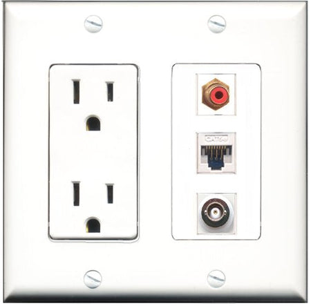 RiteAV - 15 Amp Power Outlet 1 Port RCA Red 1 Port BNC 1 Port Cat5e Ethernet White Decorative Wall Plate