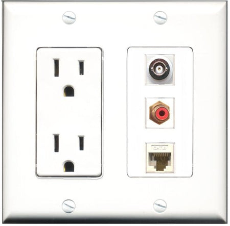 RiteAV - 15 Amp Power Outlet 1 Port RCA Red 1 Port BNC 1 Port Cat6 Ethernet Ethernet White Decorative Wall Plate