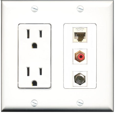 RiteAV - 15 Amp Power Outlet 1 Port RCA Red 1 Port Coax 1 Port Cat6 Ethernet Ethernet White Decorative Wall Plate