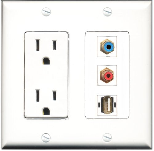 RiteAV - 15 Amp Power Outlet 1 Port RCA Red 1 Port RCA Blue 1 Port USB A-A Decorative Wall Plate