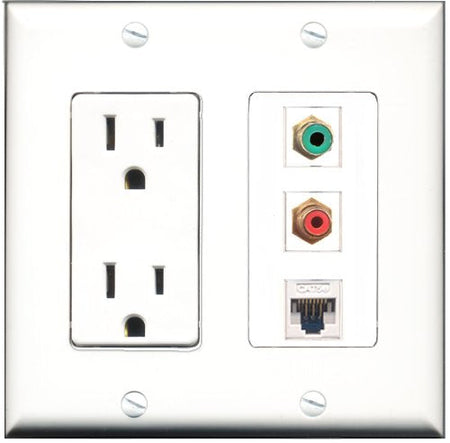 RiteAV - 15 Amp Power Outlet 1 Port RCA Red 1 Port RCA Green 1 Port Cat5e Ethernet White Decorative Wall Plate