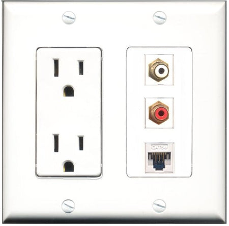 RiteAV - 15 Amp Power Outlet 1 Port RCA Red 1 Port RCA White 1 Port Cat5e Ethernet White Decorative Wall Plate