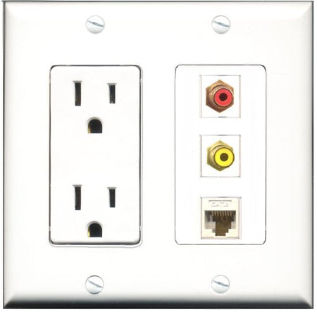 RiteAV - 15 Amp Power Outlet 1 Port RCA Red 1 Port RCA Yellow 1 Port Cat6 Ethernet Ethernet White Decorative Wall Plate