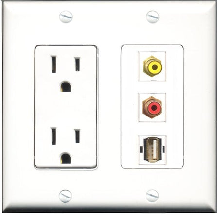 RiteAV - 15 Amp Power Outlet 1 Port RCA Red 1 Port RCA Yellow 1 Port USB A-A Decorative Wall Plate