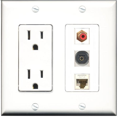 RiteAV - 15 Amp Power Outlet 1 Port RCA Red 1 Port Toslink 1 Port Cat6 Ethernet Ethernet White Decorative Wall Plate