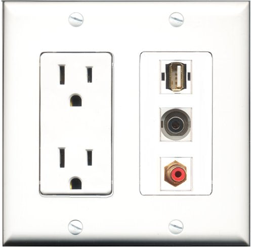 Please note: It is required to install this item in a divided outlet box. Recommended compatible outlet boxes Carlon BH234R (Old work). This is a 2 Piece Decorative Wall Plate (plate and plate cover). Tooless connection, Just plug one cable into the front and one into the back. Outlet needs to be hard wired as a regular outlet. High quality, screws included. Fits standard outlet boxes, decora(tive) plates and mounting brackets. Female on both sides of the plate jacks for easy plugin. 4 inch distance between screws. This is not a GFCI outlet and is not to be installed near or behind a kitchen sink, bathtub, bathroom or within 12-15 feet of any source of water. Must be installed into a new or existing plastic or metal outlet electrical box for safety. Do not install this with a drywall only mounting bracket.