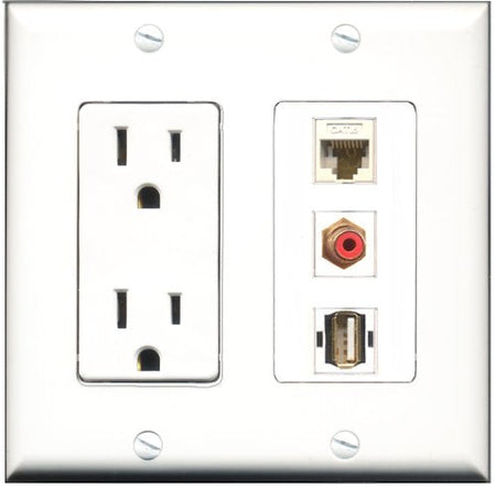 RiteAV - 15 Amp Power Outlet 1 Port RCA Red 1 Port USB A-A 1 Port Cat6 Ethernet Ethernet White Decorative Wall Plate