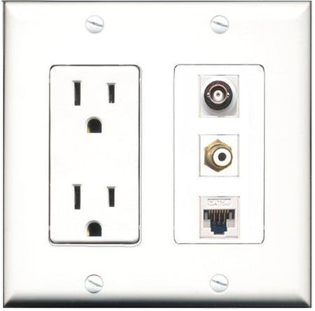RiteAV - 15 Amp Power Outlet 1 Port RCA White 1 Port BNC 1 Port Cat5e Ethernet White Decorative Wall Plate