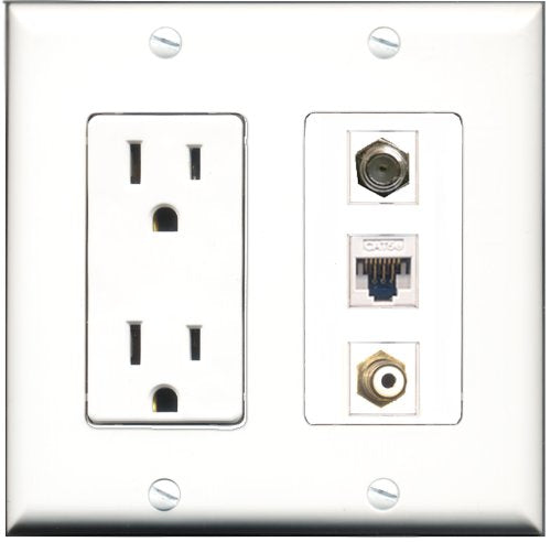 RiteAV - 15 Amp Power Outlet 1 Port RCA White 1 Port Coax 1 Port Cat5e Ethernet White Decorative Wall Plate
