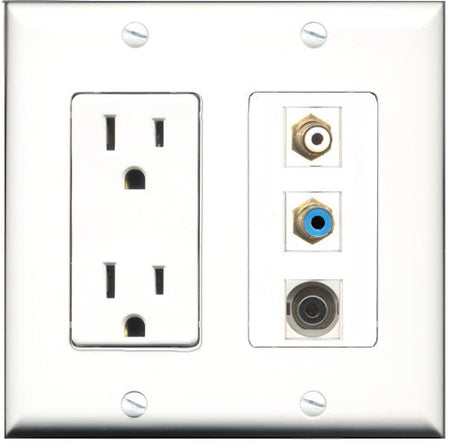 RiteAV - 15 Amp Power Outlet 1 Port RCA White 1 Port RCA Blue 1 Port 3.5mm Decorative Wall Plate