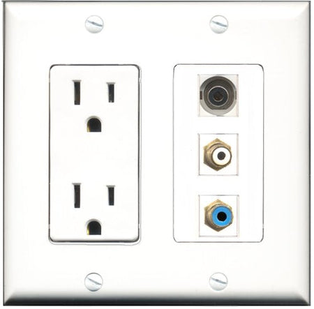 RiteAV - 15 Amp Power Outlet 1 Port RCA White 1 Port RCA Blue 1 Port 3.5mm Decorative Wall Plate