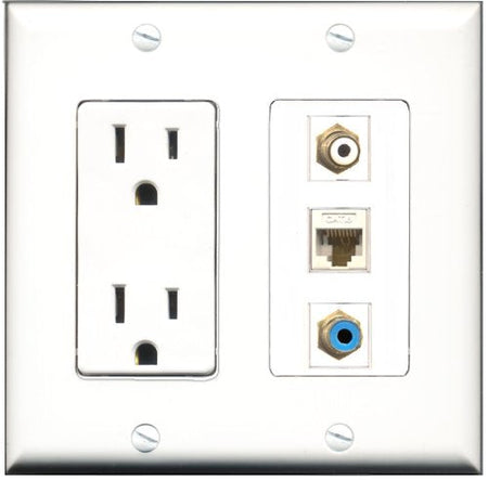 RiteAV - 15 Amp Power Outlet 1 Port RCA White 1 Port RCA Blue 1 Port Cat6 Ethernet Ethernet White Decorative Wall Plate
