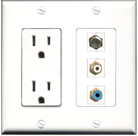 RiteAV - 15 Amp Power Outlet 1 Port RCA White 1 Port RCA Blue 1 Port Coax Decorative Wall Plate